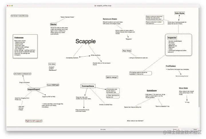 这款思维导图工具的独特之处在于,没有各种烦人的格式或者规则。打开 Scapple,只有一张白纸。你可以在上面的任何地方创建任何节点和关连,并且支持将链接、注释与你的各种想法快速组合在一起。Scapple 使用简单,操作自由。