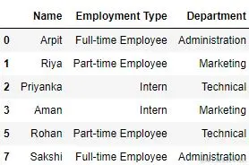 print('DataFrame after removing all the instances of the duplicate rows found in the "Name" and "Department" columns:')