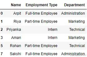DataFrame after removing all the instances of the duplicate rows found in the "Name" and "Department" columns: