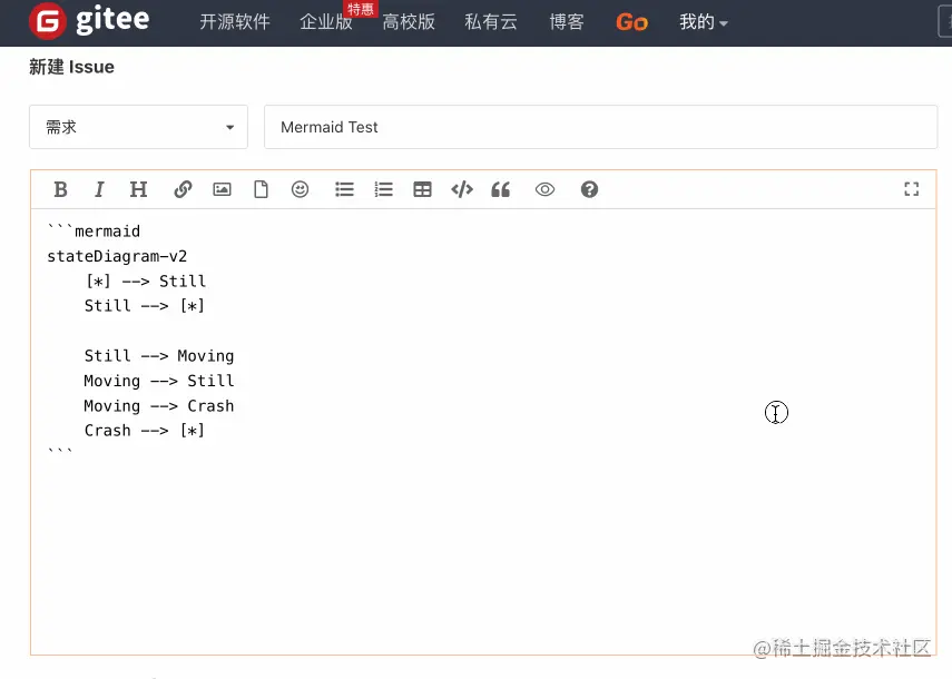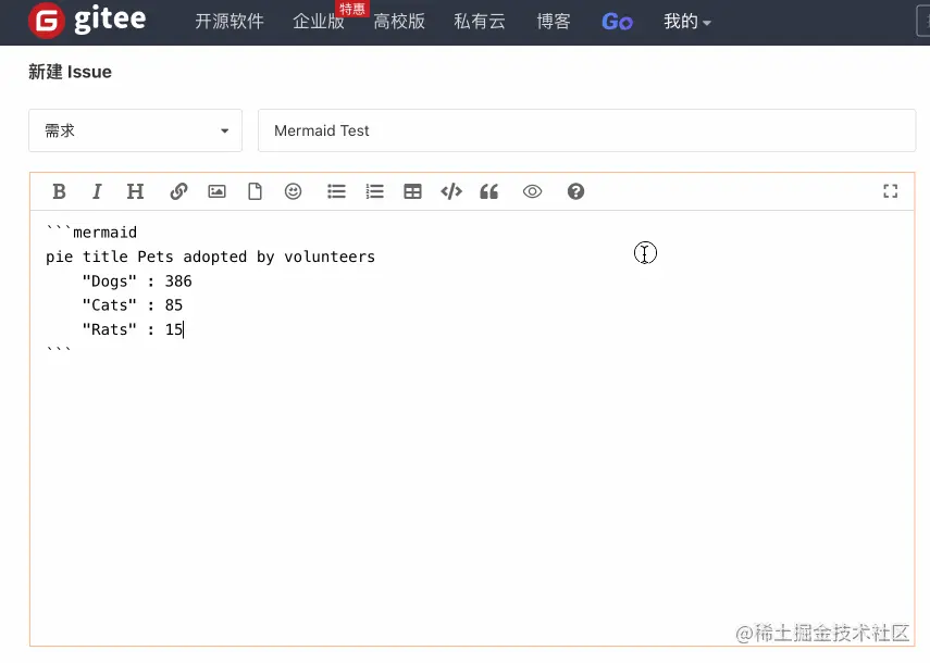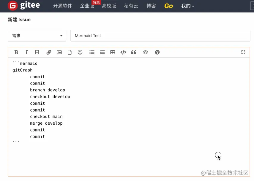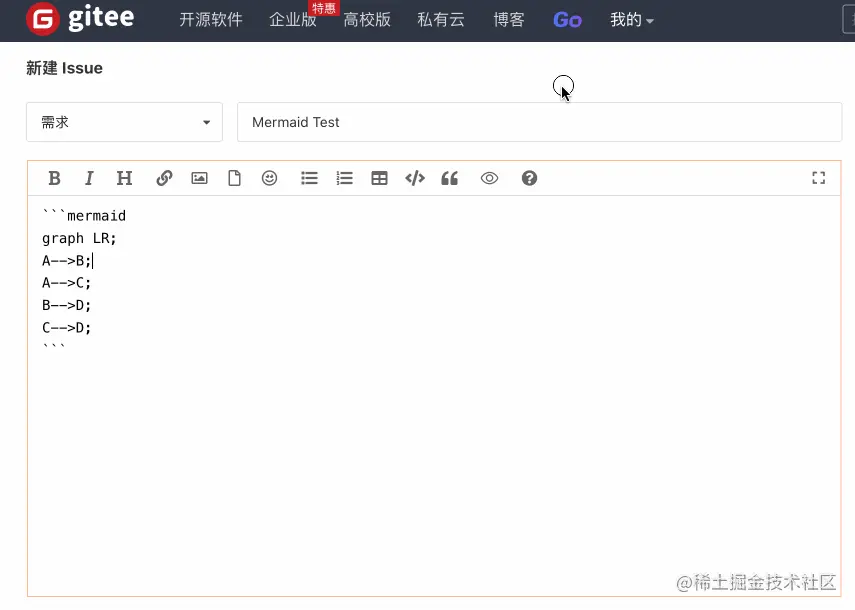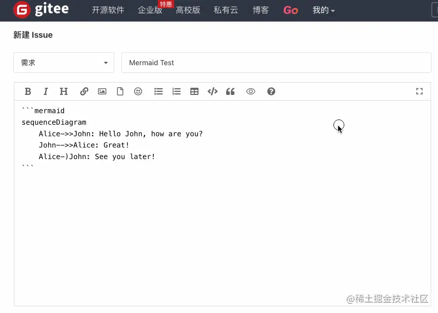 Gitee 中的 Markdown 编辑器已经全面支持 Mermaid,你可以在仓库的 PR、Issue、Readme、Wiki 和评论中使用 Mermaid,通过图表来更全面地发表你的观点。
