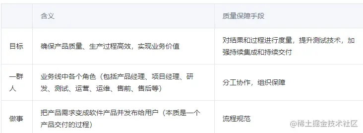 质量保障体系:企业内部系统的技术和管理手段,是有计划的、系统的企业活动。目的是满足业务发展需要,生产出满足质量目标的产品,即为了共同的目标,一群人一块儿做事。