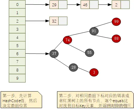 - 根据hashCode找到的数组下标可能会同时对应多个key(所谓的hash碰撞,不同元素产生了相同的hashCode值),这个时候使用key对象提供的equals()方法,进行逐个元素比对,直到找到相同的元素,返回其所对应的值。