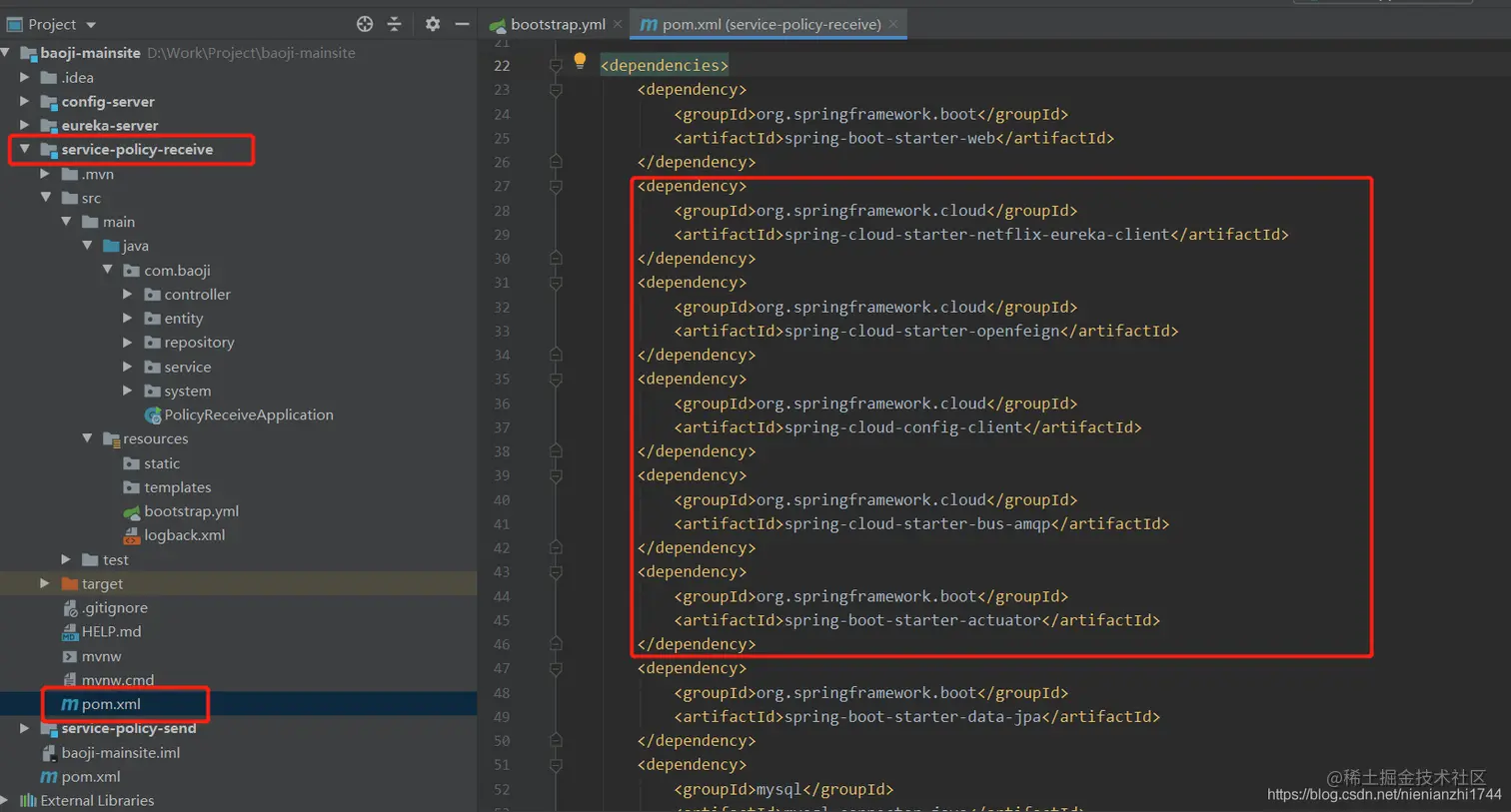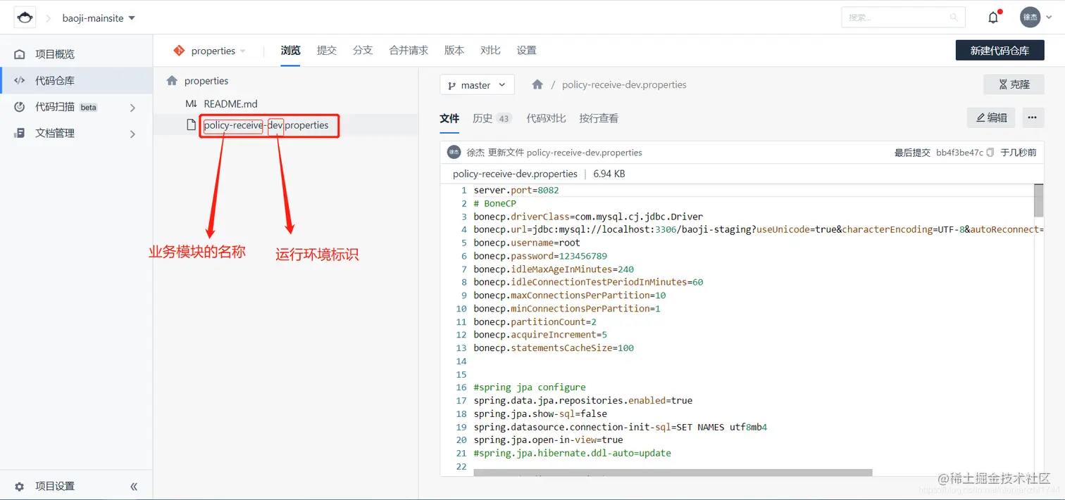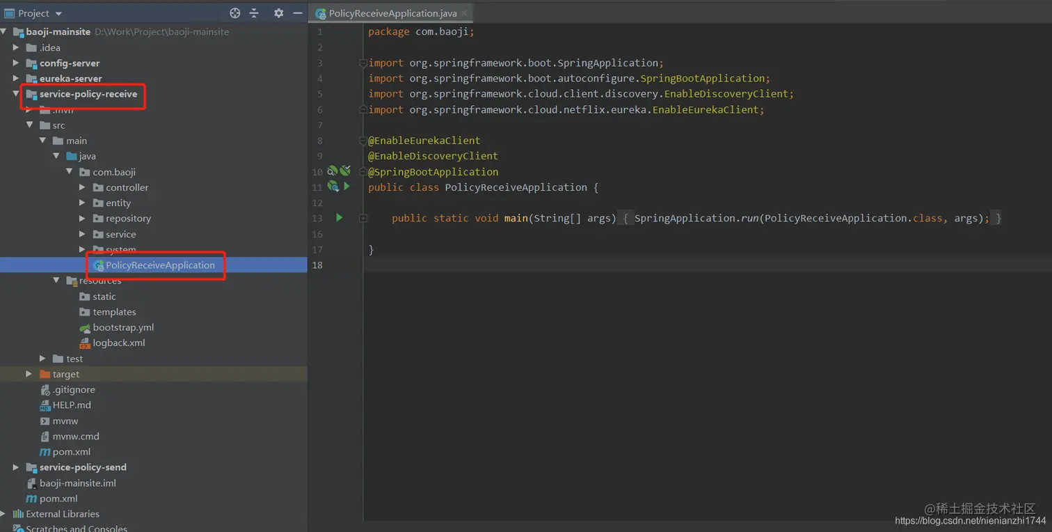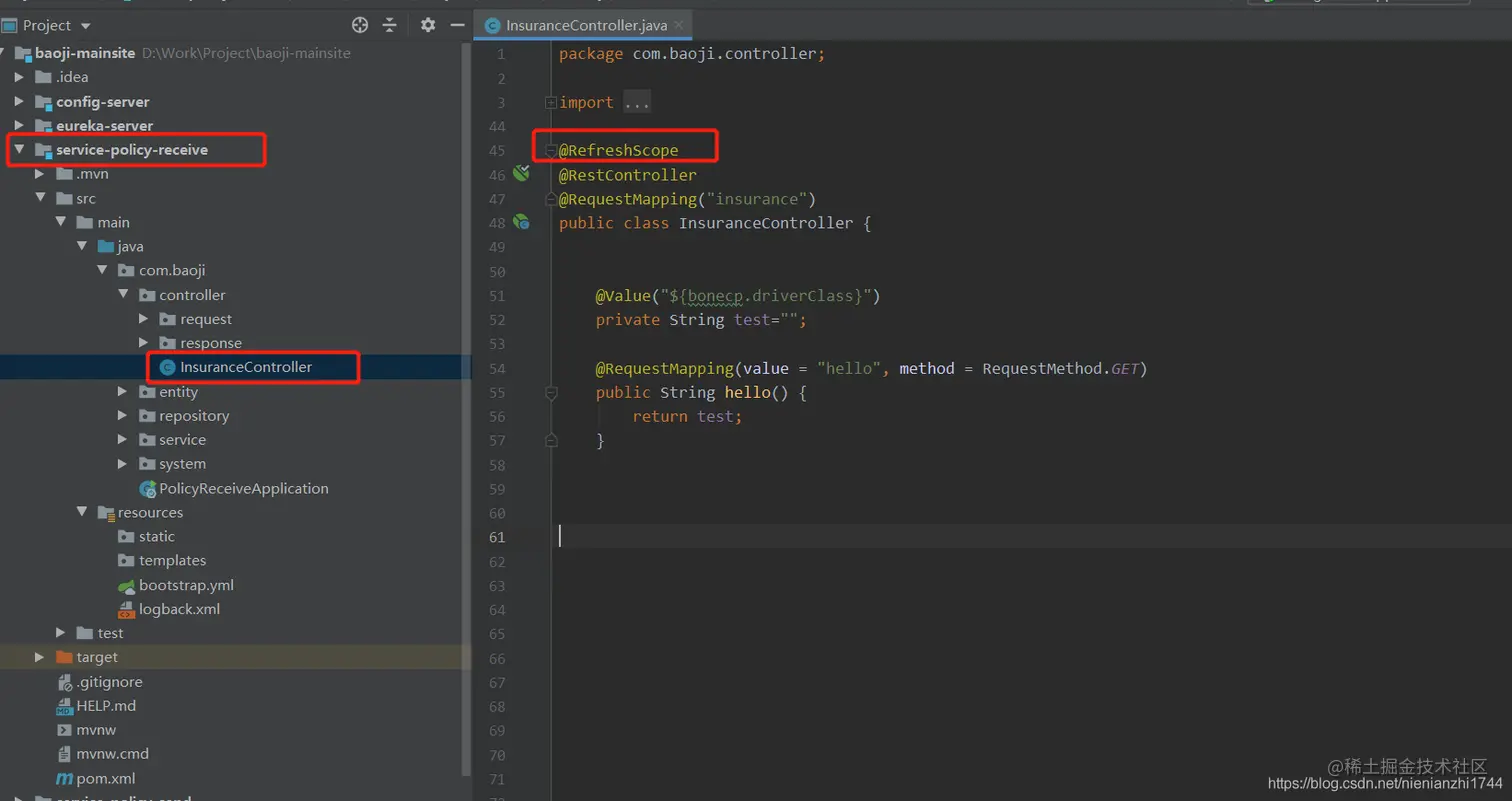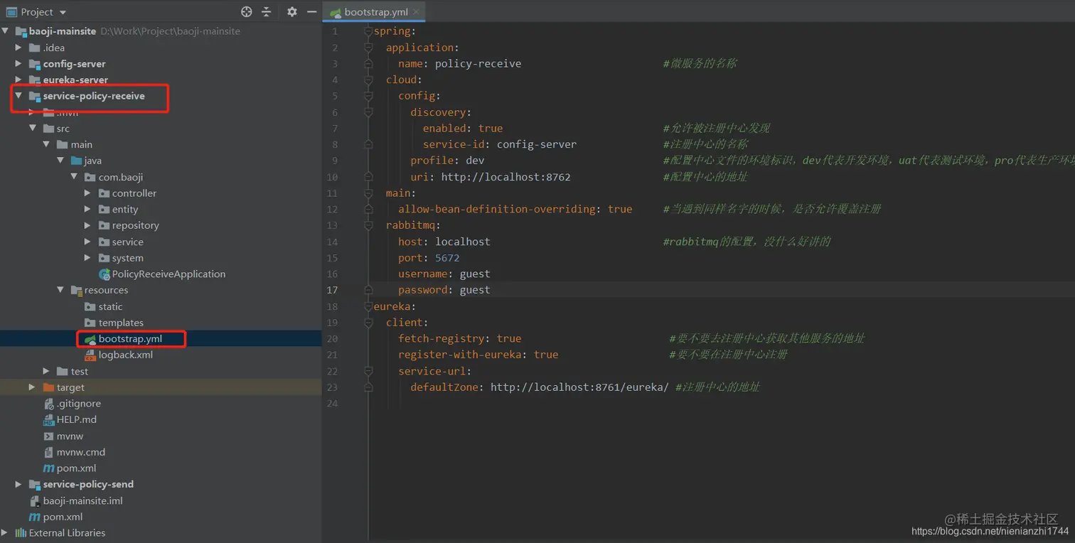 4.1:如上图所见,我本地跟业务相关的微服务有两个,我以其中一个为例(微服务名称为:policy-receive),以下代码和项目结构奉上。值得注意的是:1:当我们在创建一个springboot的微服务工程的时候,配置文件的名称一般都是 application.yml或application.properties。但是由于我们要实现配置文件的自动刷新,我们要将application.yml(或是application.properties)重命名为bootstrap.yml(或是bootstrap.properties)。因为bootstrap.yml的加载顺序在application.yml前面,所以只有先从bootstrap.yml中获取coding上的application文件,然后程序再读取这个远程application文件。2:远程配置文件的命名问题。coding上的配置文件命名需要遵从最基本的 客户端微服务名称+环境标识 的规则。如上文第二个步骤的远程配置文件图所示,至于环境标识如下图所示。3:如果远程配置文件中和本地bootstrap.yml这个文件中有相同的属性,那么远程的配置会替换掉本地的配置。