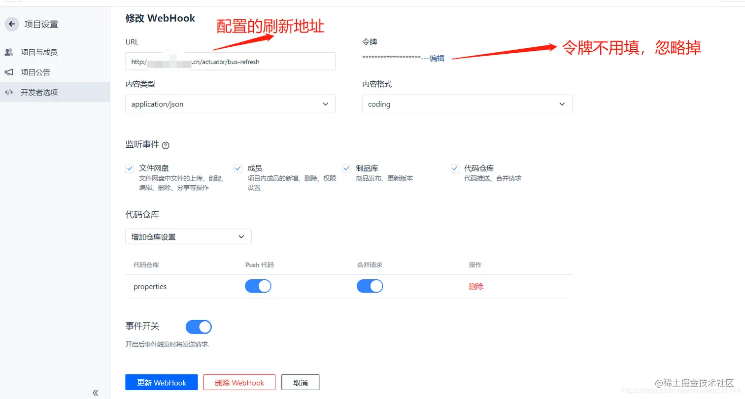这里要注意的是这个webhook的url是配置中心(config-server)的网址+路径,不能使用ip地址:端口号+路径的形式。所以我用花生壳将我的内网ip和配置中心(config-server)的端口号8762进行了内网映射。至于url的路径为什么是bus-refresh,是因为我们在上文第三个大步骤的3.3有提到,在配置文件中指定的刷新地址就是bus-refresh。在该页面代码仓库中的下拉框中选择配置文件所在的代码仓库。到此为止,coding端的webhook配置已经完成。