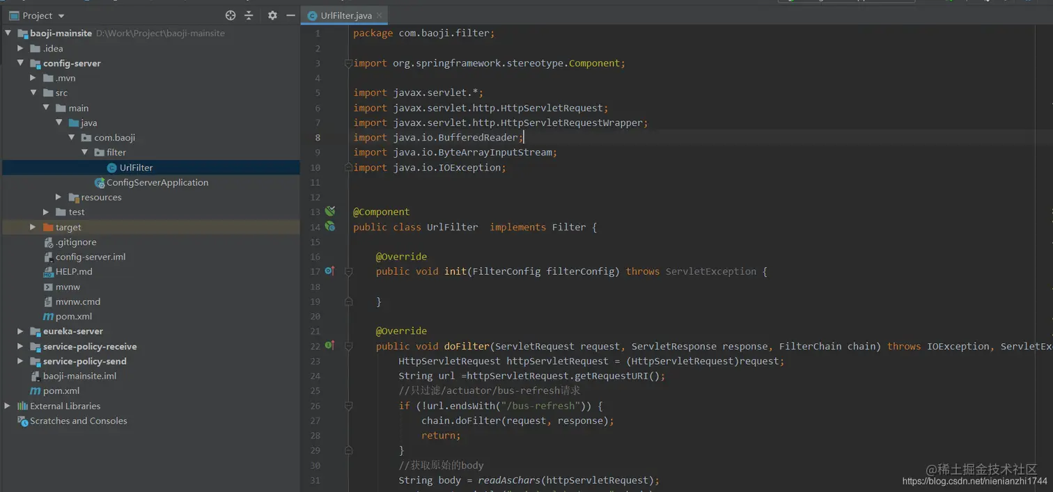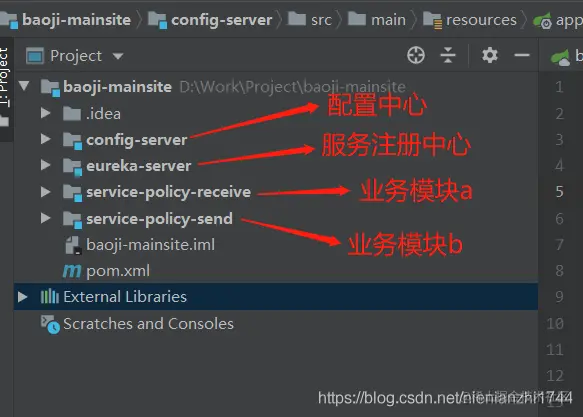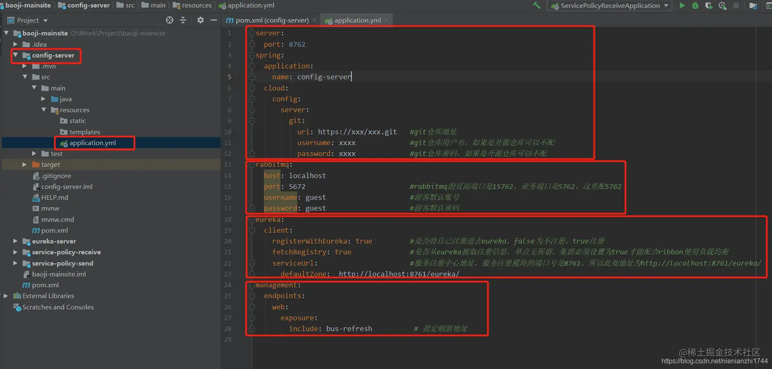在本地的sringcloud项目中至少有3个微服务程序或是微服务模块。分别是:服务注册中心(eureka-server)、配置中心(config-server)、业务模块(我的业务模块a的自定义名字是:policy-receive)。服务注册中心(eureka-server)的配置没啥好说的,配置中心和业务模块的配置稍微复杂一些,后文会讲