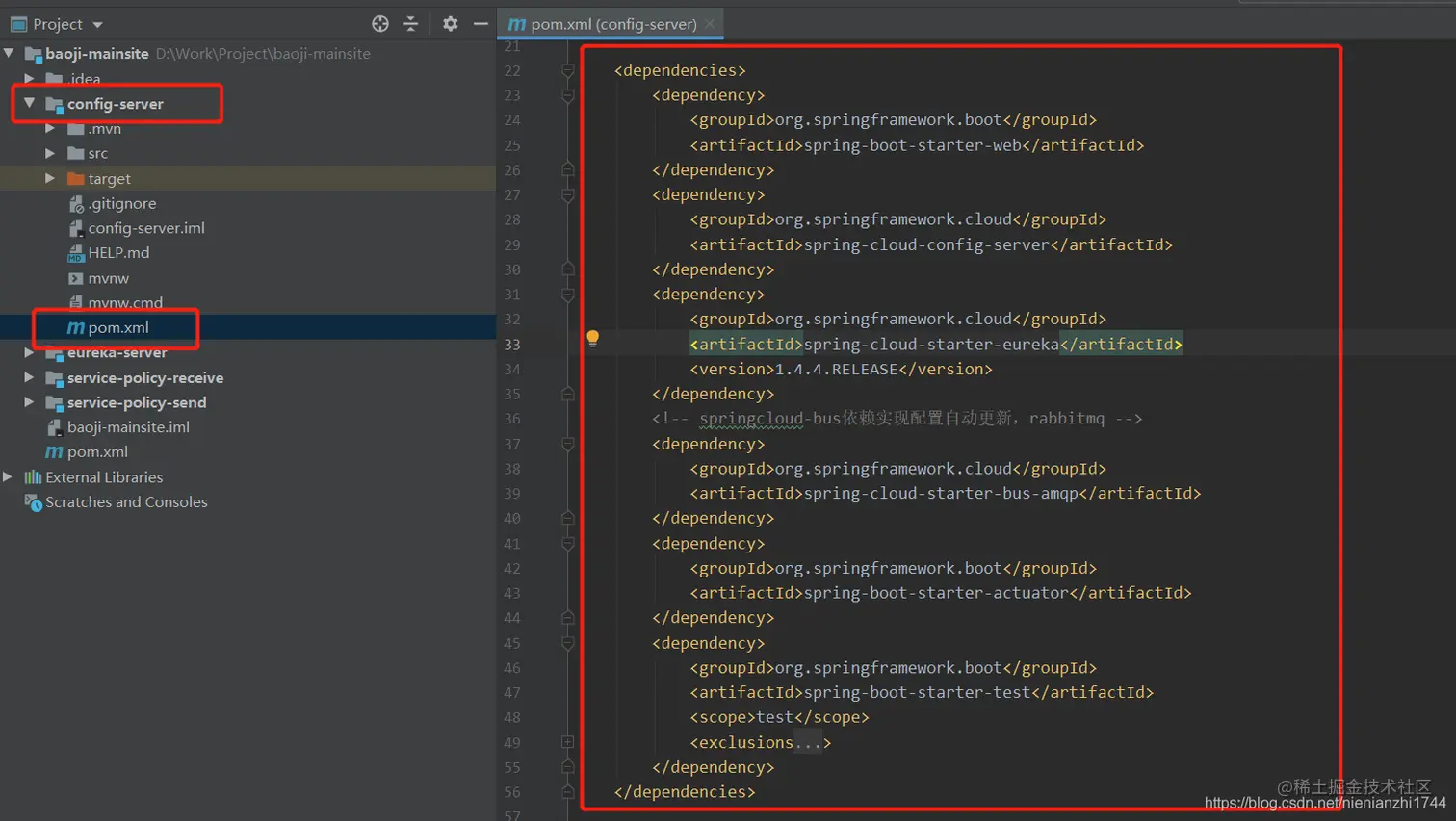 3.2:在配置中心模块(config-server)添加依赖,重点在spring-cloud-starter-bus-amqp、spring-boot-starter-actuator这两个jar包上,其余的是一 些springcloud的常规jar包。