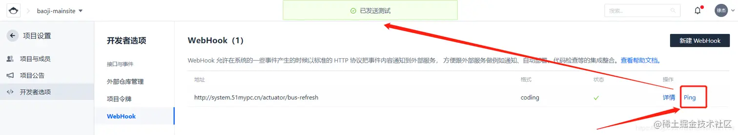 然后我们返回到coding的webhook页面,看到列表中已经有一条我们刚才新增的webhook配置了,点击ping,进行测试