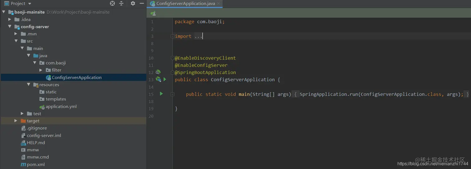 3.4:配置中心启动文件,添加@EnableDiscoveryClient、@EnableConfigServer这两个注解。第一个注解的意思是作为微服务客户端被注册,第二个注解的意思是当前程序作为配置中心。到此为止springcloud-config已经配置完成。