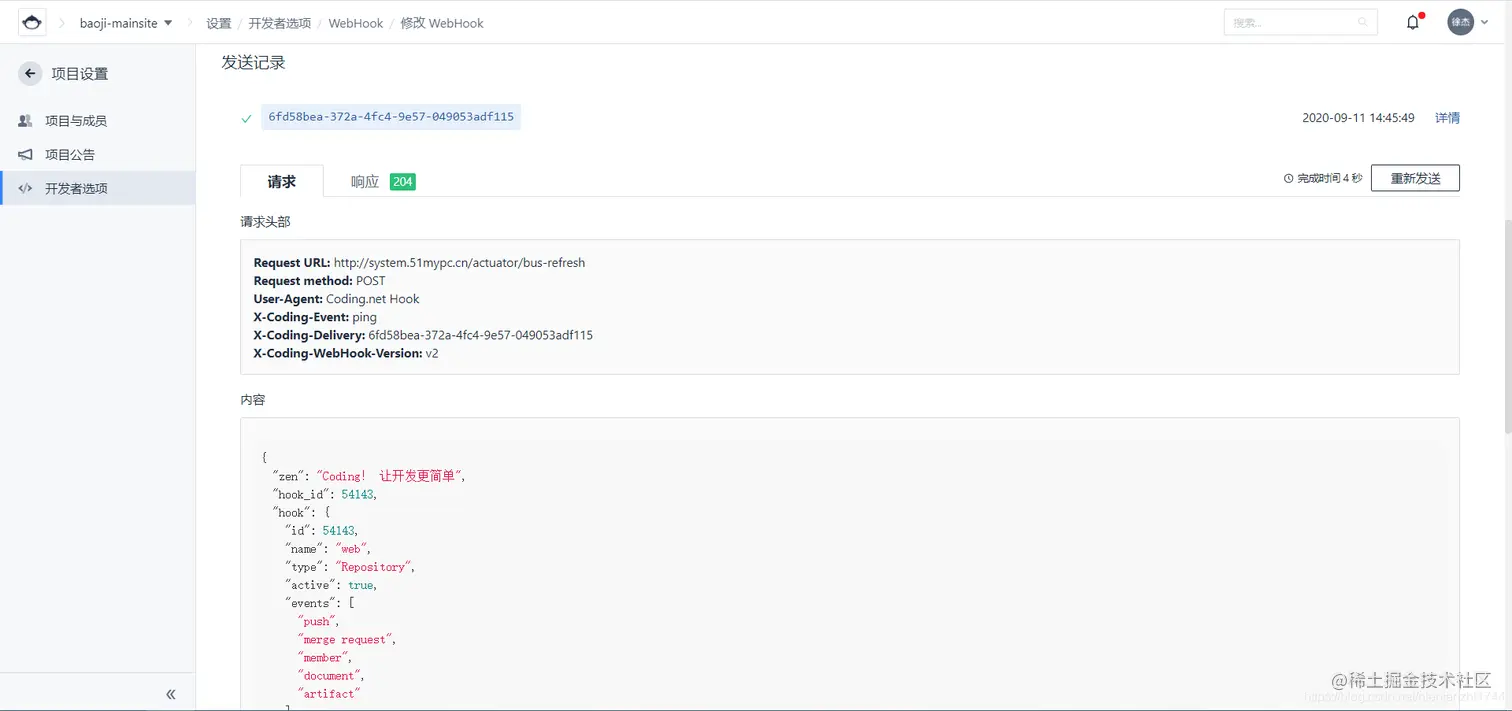 同时可以看到我们的配置中心接收到了一条请求,请求的内容如下。说明我们的webhook配置没问题了。
