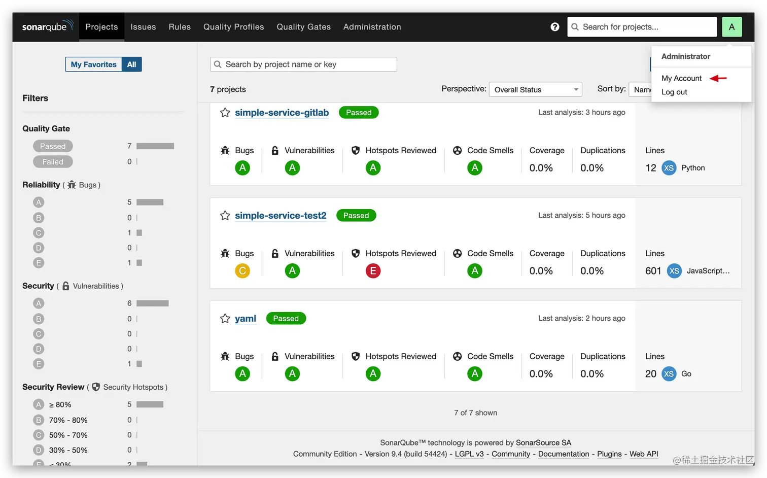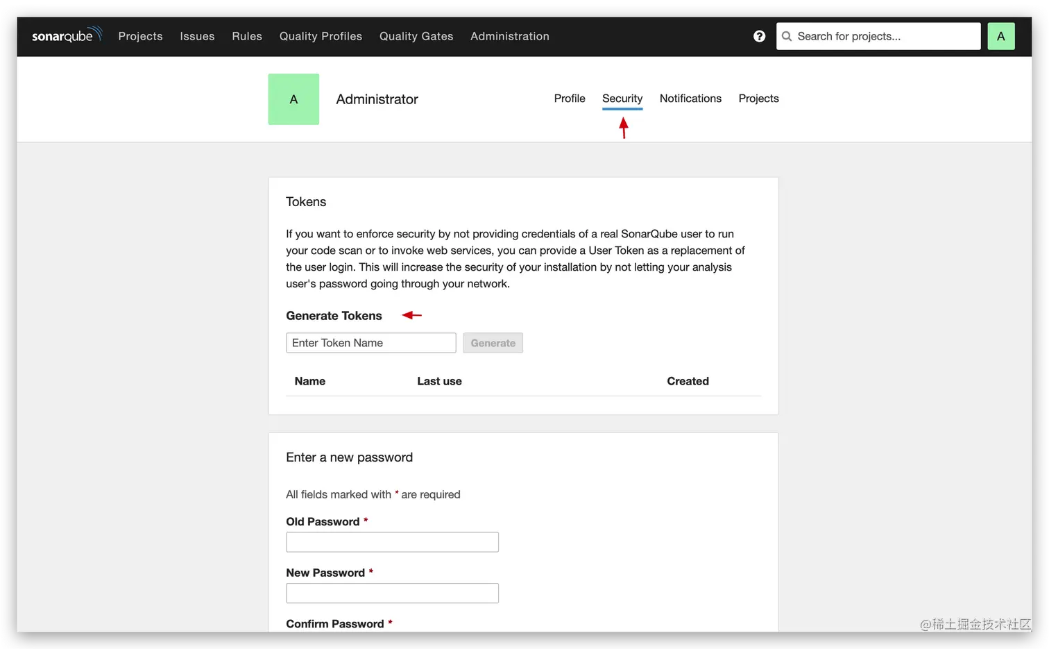 - 登录 SonarQube -> 点击右上角账号头像 ->