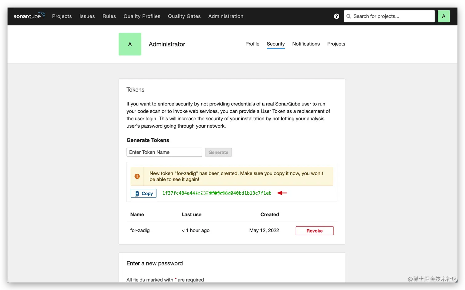 Security页面,在Generate Token中填写 Token 名称后点击右侧的Generate按钮即可。