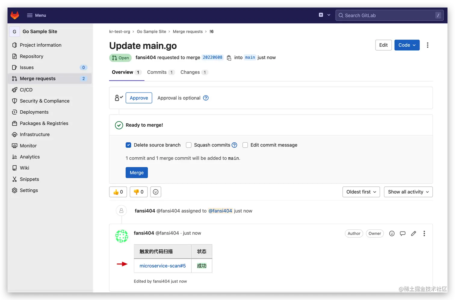代码库变更自动触发代码扫描后,扫描结果将会反馈到代码仓库中,目前支持 GitLab 代码源,其他代码源也进一步支持中。及时的代码质量反馈可以为团队做代码审查、代码合并等提供数据参考,让质量溶于每一行代码。