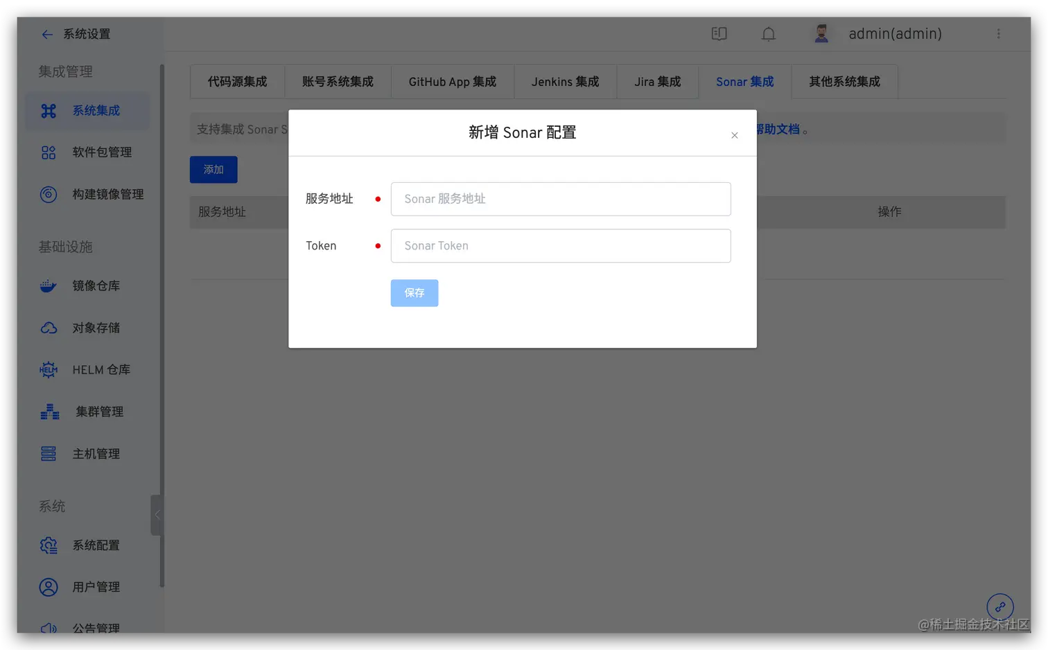 系统设置->集成管理->Sonar 集成,填写 SonarQube 服务器地址以及 Token 信息后保存。