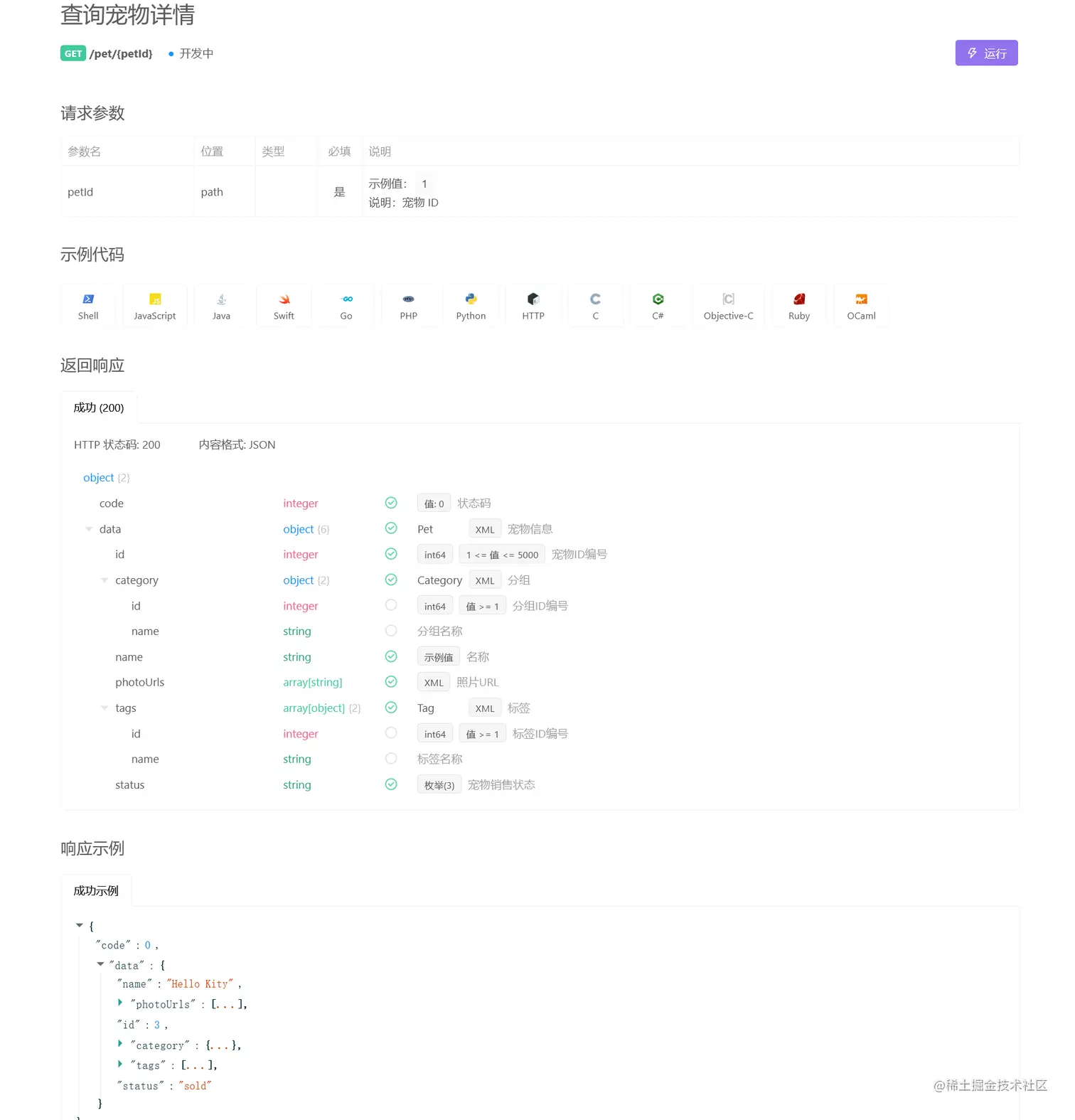 另外,在接口文档上也提供了额外的功能支持,可以生成接口的请求代码,也可以点击运行,对接口文档发起调试。