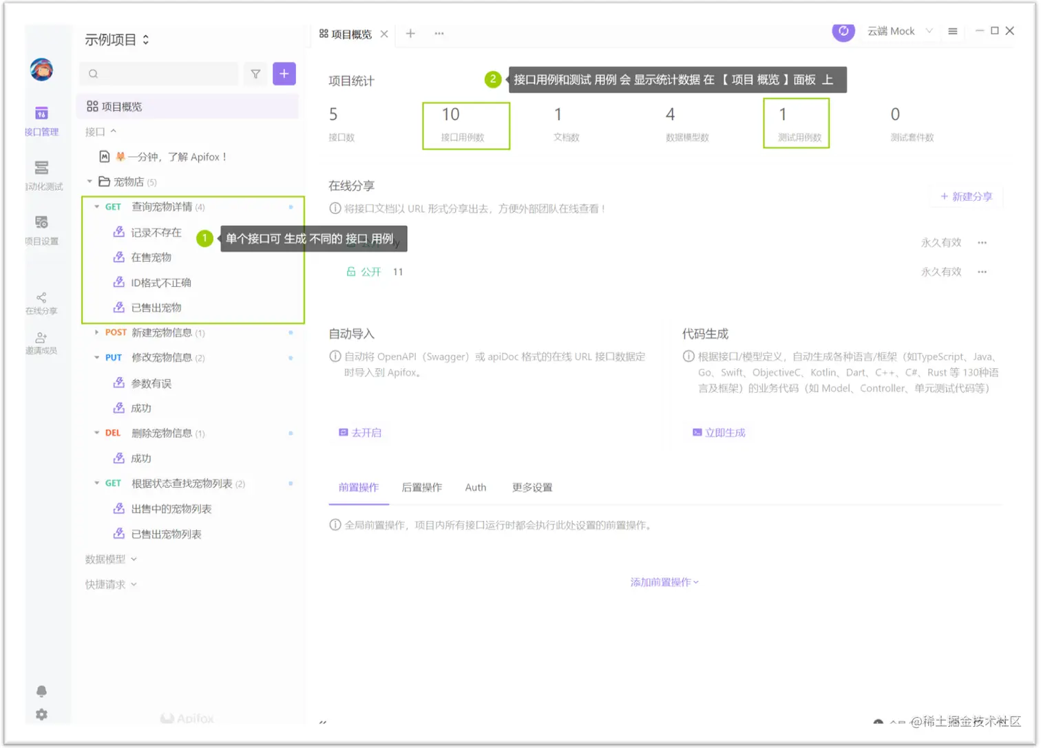 然后在这个基础上,基于项目接口的设计、开发、mock、测试、修改、维护,使用 Apifox 这个功能去联通和更新各端的数据,减少大家修改和维护的成本。