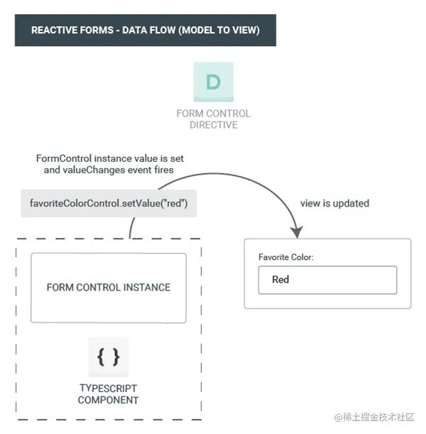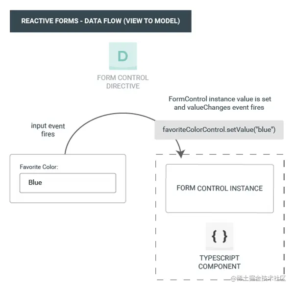 favoriteColorControl.setValue()方法被调用,它会更新这个FormControl的值。FormControl实例会通过valueChanges这个可观察对象发出新值。valueChanges的任何订阅者都会收到这个新值。- 该表单输入框元素上的控件值访问器