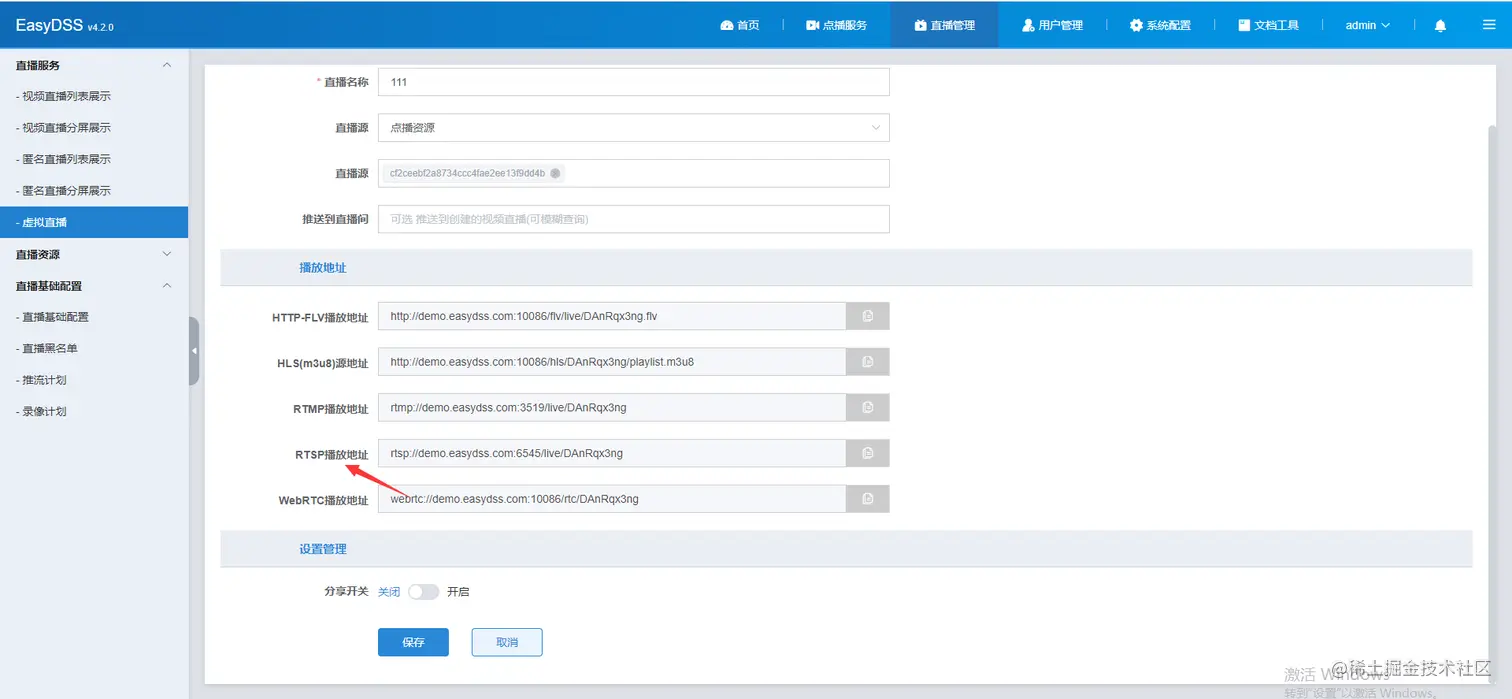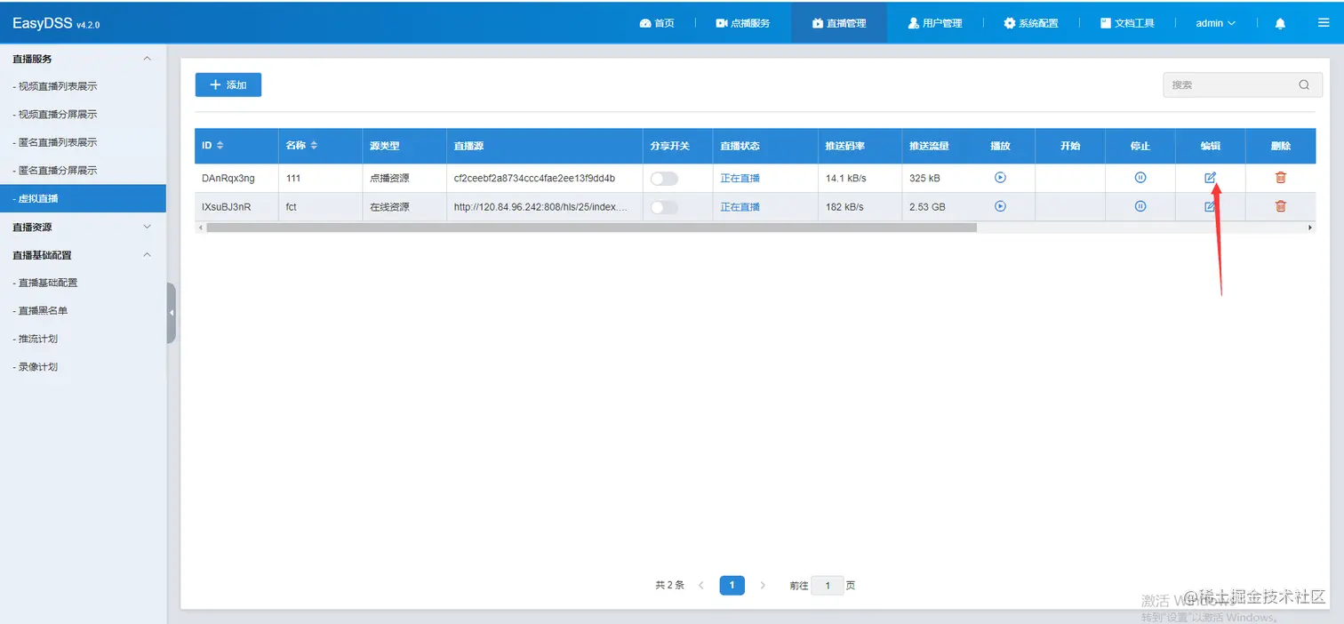 3)如图,点击编辑,此时可以获取到RTSP的视频流了: