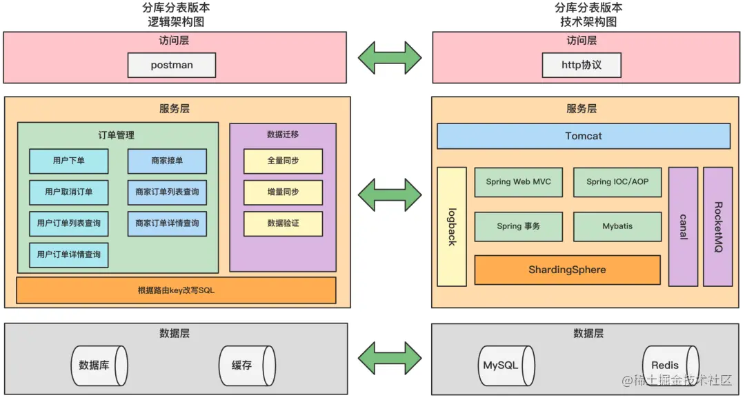 整个分层没有变化,分库分表后还是分为了三层,分别是访问层、服务层和数据层,还是从上到下逐一介绍:
