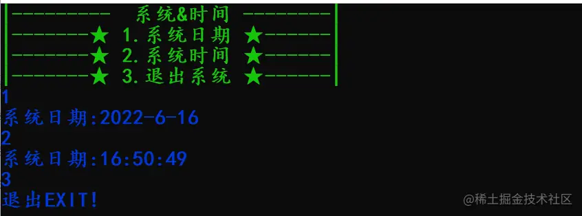 #define _CRT_SECURE_NO_WARNINGS 1 #include<stdio.h> #include<time.h> #include<Windows.h> //结构体指针变量指向(->)的就是结构体类型当中成员变量 struct tm* fun_Time; void color(short x) { if (x >= 0 && x <= 15) SetConsoleTextAttribute(GetStdHandle(STD_OUTPUT_HANDLE), x); else SetConsoleTextAttribute(GetStdHandle(STD_OUTPUT_HANDLE), 7); } void menu() { color(0); system("cls"); color(10); printf("|--------- 系统&时间 --------|\n"); printf("|-------★ 1.系统日期 ★------|\n"); printf("|-------★ 2.系统时间 ★------|\n"); printf("|-------★ 3.退出系统 ★------|\n"); } void Time() { time_t Time;//定义时间类型 time(&Time);//获取系统日期 //注:指针变量接收地址,在这里我们定义了结构体指针变量所以只需要用结构体指针当中变量用来存储地址即可。 //struct tm* fun_Time = localtime(&Time);同理 fun_Time = localtime(&Time);//转换为系统时间 } int main(void) { const int date[4] = {0,1,2,3}; int n = 0; printf("请输入[0]获取帮助信息:"); while (1) { color(1); scanf_s("%d", &n); if (date[0] == n) menu(); else if (date[1] == n) { Time();//时间属性 printf("系统日期:%d-%d-%d\n", 1900 + fun_Time->tm_year, fun_Time->tm_mon + 1, fun_Time->tm_hour); } else if (date[2] == n) { Time();//时间属性 printf("系统日期:%d:%d:%d\n", fun_Time->tm_hour, fun_Time->tm_min, fun_Time->tm_sec); } else if (date[3] == n) { printf("退出EXIT!\n"); break; } else printf("你输入的指令错误,请重新输入:"); } return 0; }