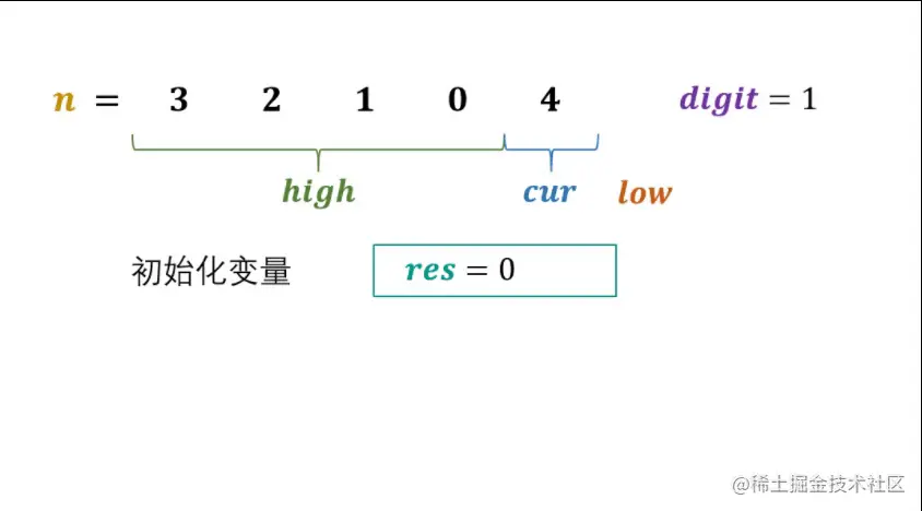 变量递推公式: . 设计按照“个位、十位、.. 的顺序计算,则high/cur/low/digit应初始化为: .