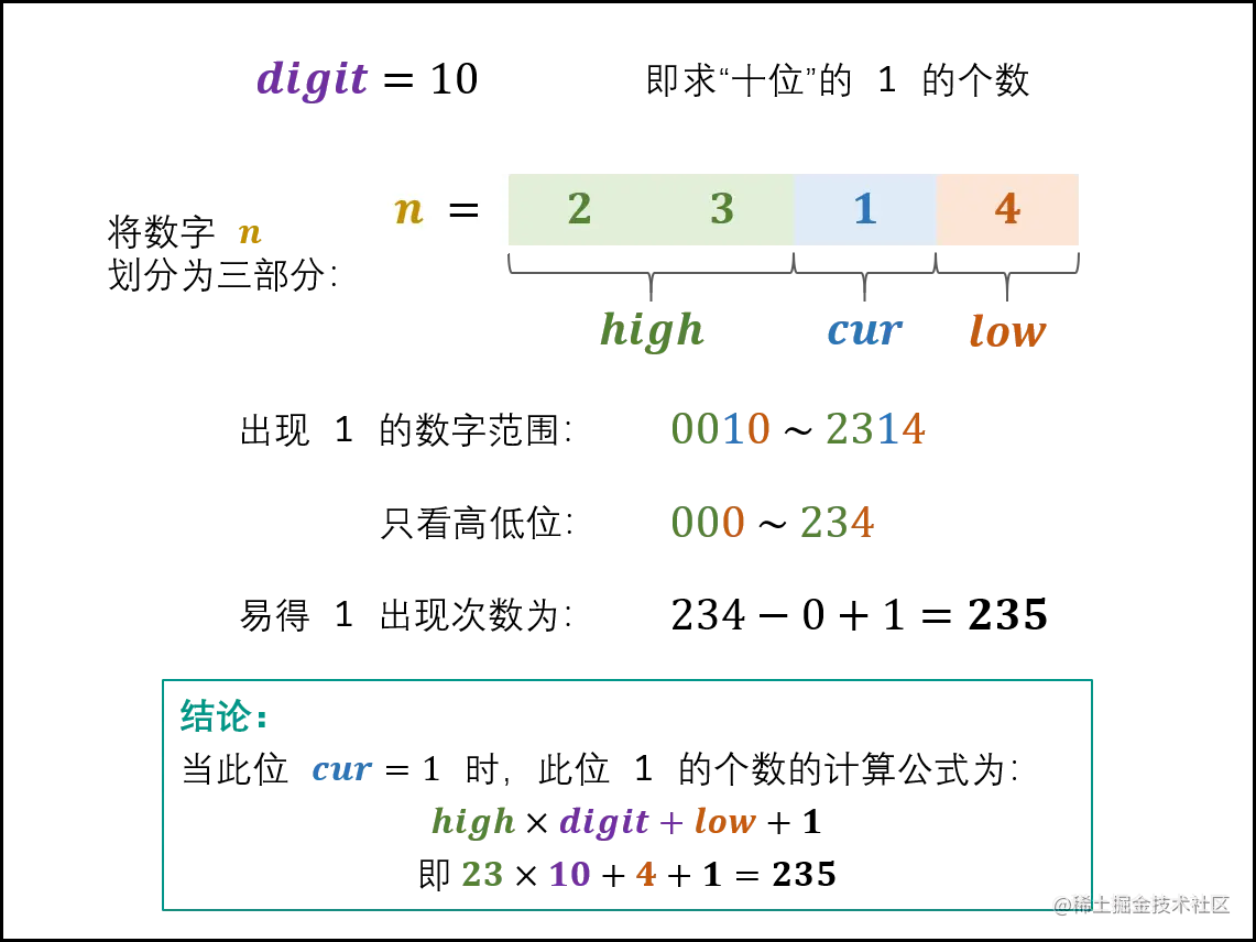 - 当cur=2,3,... ,9时:此位1的出现次数只由高位high决定,计算公式为: (high+ 1) x digit . 如下图所示,以n= 2324为例,求digit= 10 (即十位) 的1出现次数。