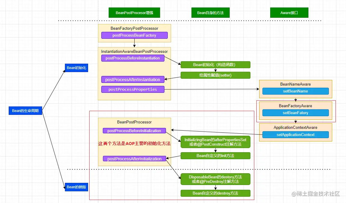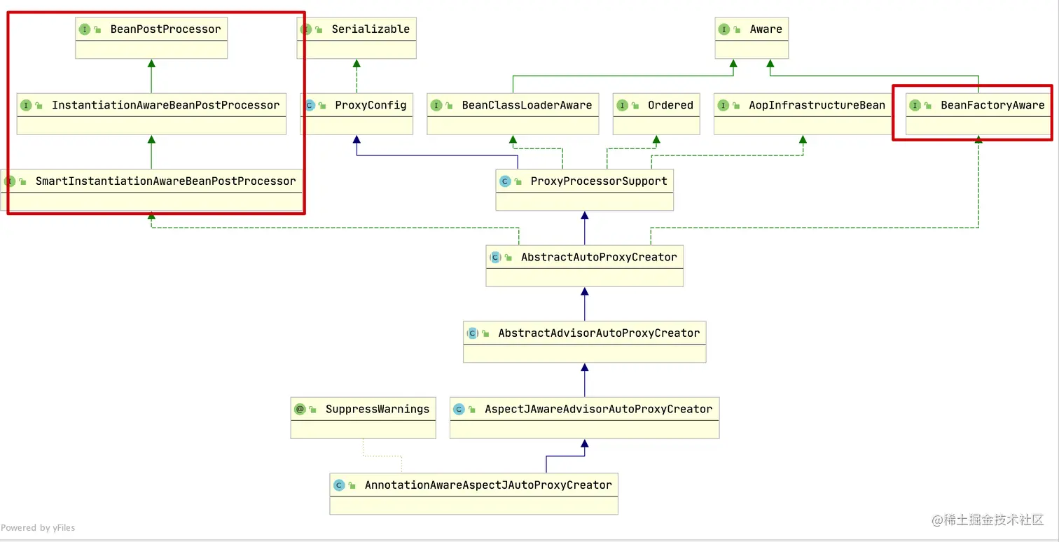 - AspectJAwareAdvisorAutoProxyCreator实现了两类接口,BeanFactoryAware和BeanPostProcessor;根据Bean生命周期方法找到两个核心方法:postProcessBeforeInstantiation和postProcessAfterInitialization