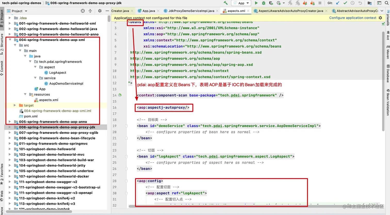 - 前文中我们写了AOP的Demo,根据其XML配置我们不难发现AOP是基于IOC的Bean加载来实现的;这便使我们的主要入口