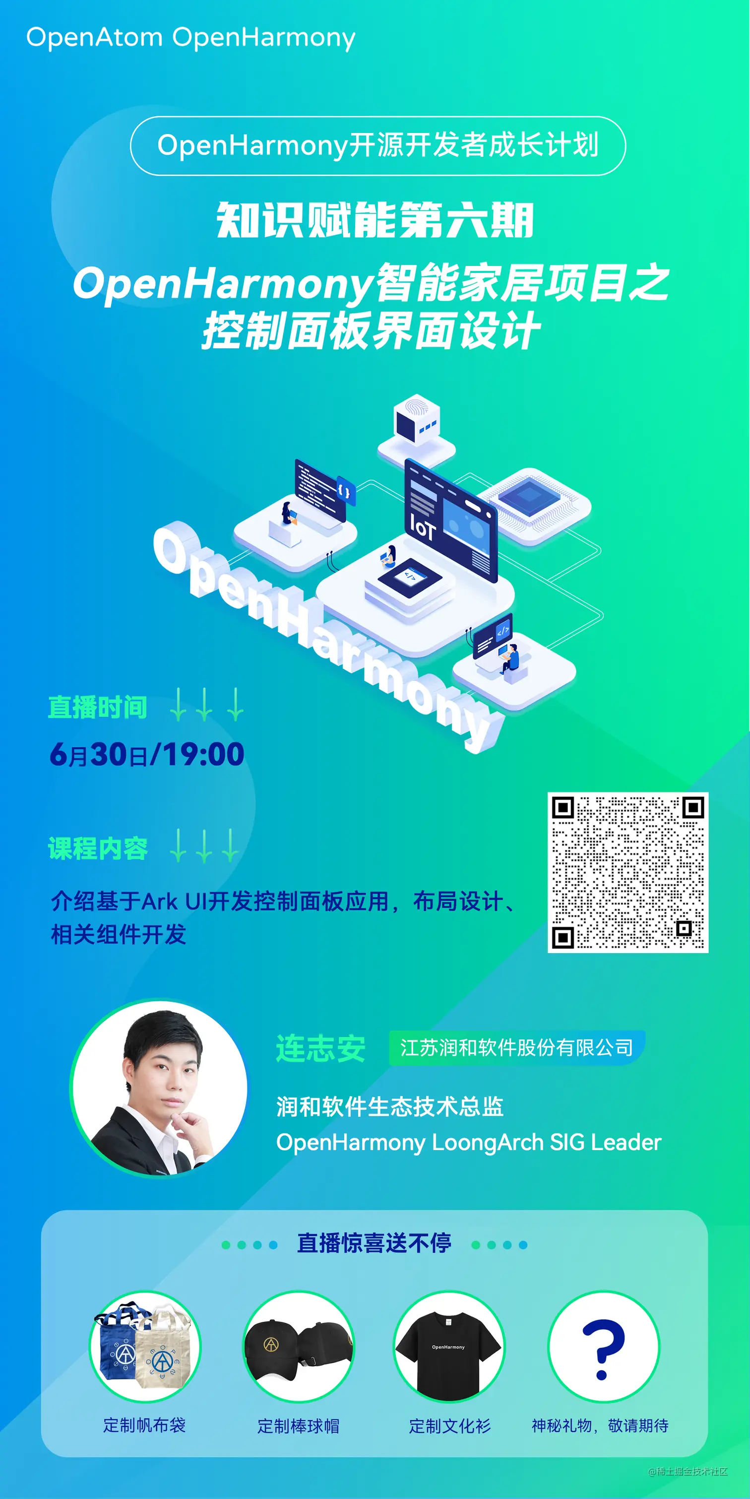 而第2节直播《OpenHarmony智能家居项目之控制面板界面设计》中,连志安老师将介绍基于ArkUI开发控制面板应用,布局设计、相关组件开发,具体包括控制面板的布局设计以及ArkUI相关组件的使用,依旧干货满满!