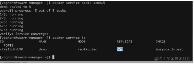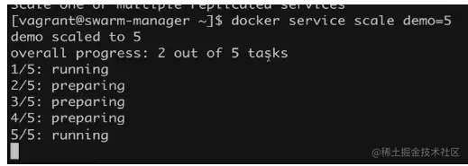 这里我们希望该service扩展有5个,可以执行上面的命令,会尝试去创建5个任务,然后running完成之后我们可以看到变化了: