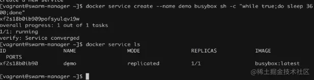 docker service create --name demo busybox sh -c "while true;do sleep 3600;done"