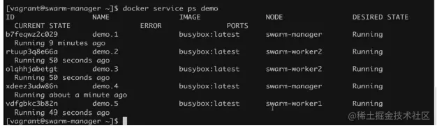 看node,目前运行在swarm-manager节点上面。