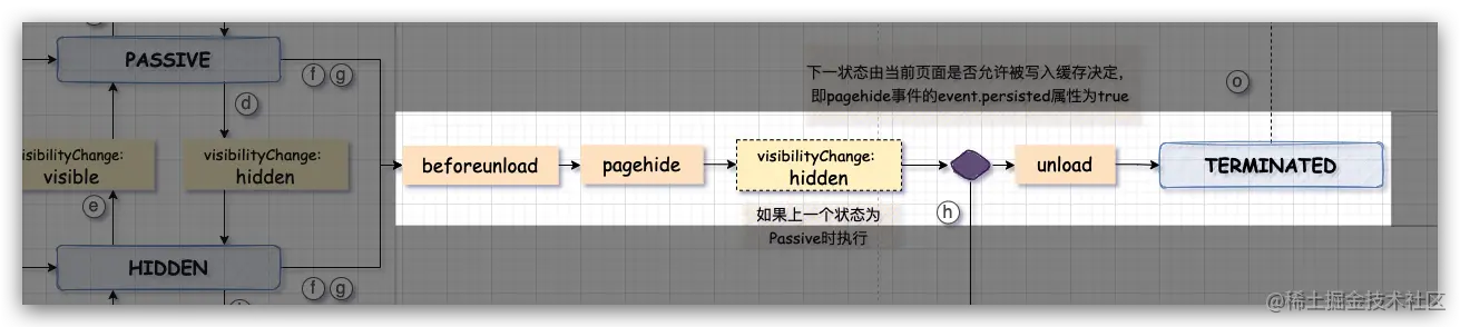 window.addEventListener('pagehide', event => { if(event.persisted) { // 下一个状态为 Frozen (bfcache) } else { // 下一个状态为 Terminated } }) -