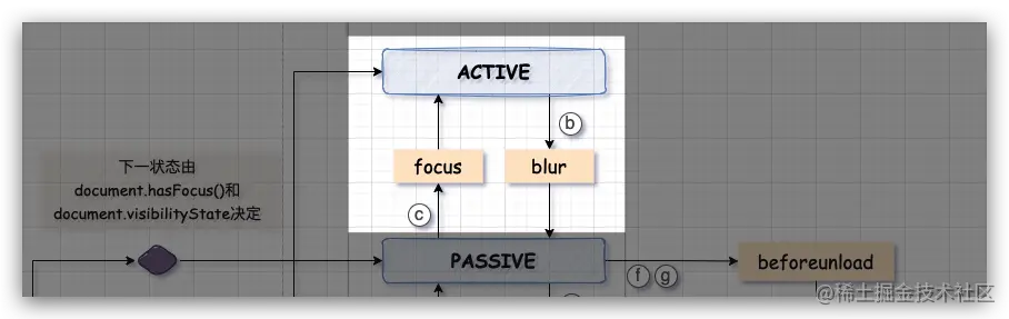焦点变化会导致页面在 active 和 passive 两个状态间切换,可以使用 document.hasFocus() API 来得到页面当前的状态。在焦点状态发生变化时,还会在 window 上触发 focus 或 blur 事件。
