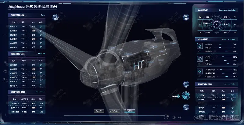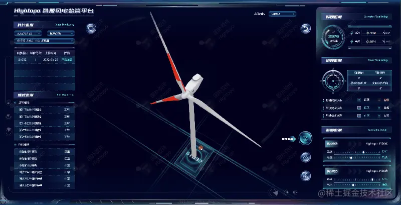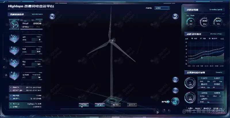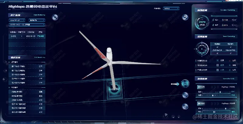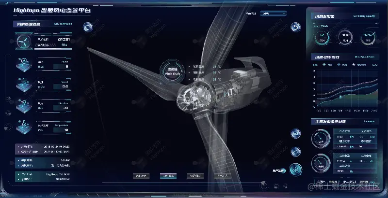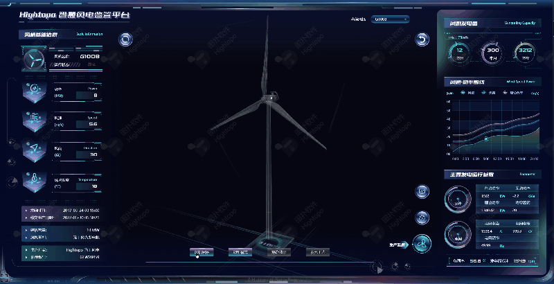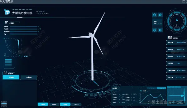图扑软件利用自主研发的 HT for Web 产品,搭建出了风机系统内在发电工艺的三维模型。1:1 还原风机的外部结构以及主要部件,并通过对接物理传感器的实时数据,还原风机各个部件的关键数据,构建风电场机组全面的生产感知力,实现环境、电量、性能可视化。