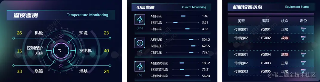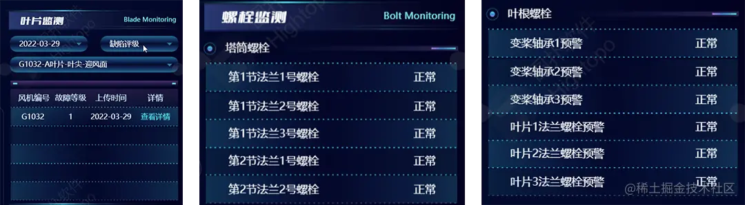 我们还设计了炫酷的一站式风机数据可视化展示平台,自由部署实时数据,项目运行状态和健康状态尽收眼底。