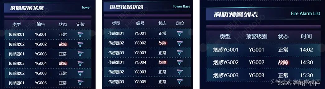 图扑软件 HT 引擎通过对接多级部署传感器,对塔筒整体进行倾斜状态监测、塔基角度监测,及早告警,确保塔筒保持健康稳定的运行状态,减少安全事故发生。