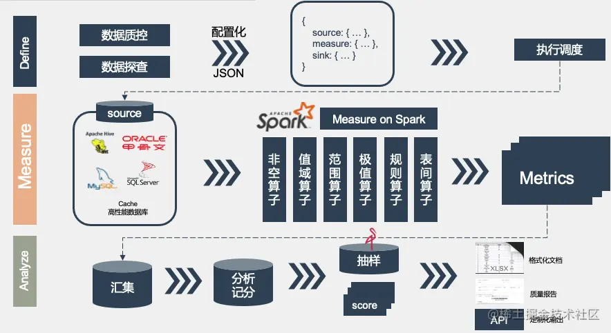 按照整体的系统设计思想,引擎与 Apache DolphinScheduler 分别解耦,各司其职,可单独执行也可以与 Apache DolphinScheduler 配合使用。引擎抽象层设计有 source、measure、sink、sample和score(记分规则):
