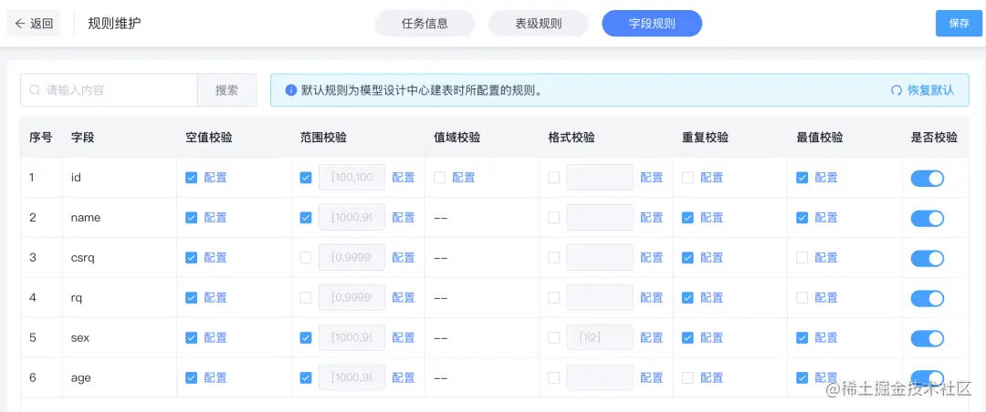 数据质控在应用端采用配置化方式,降低使用成本,提供了可选表级与字段级质控范围,进行不同数据的定制化任务设定。