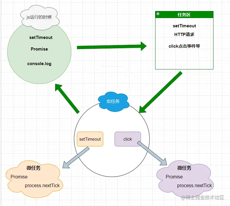 这里简单解答一下,就是当js执行的时候将所有任务丢到任务区,然后经过任务区识别并进行分拣处理,当遇到比如定时器或者点击事件这类需要消耗大量时间的任务,会存到任务队列,然后划分为宏任务,并将他们细分到微任务解决,也就是让这些复杂的逻辑处理放到宏任务队列之后,让他们自己内部消化处理。