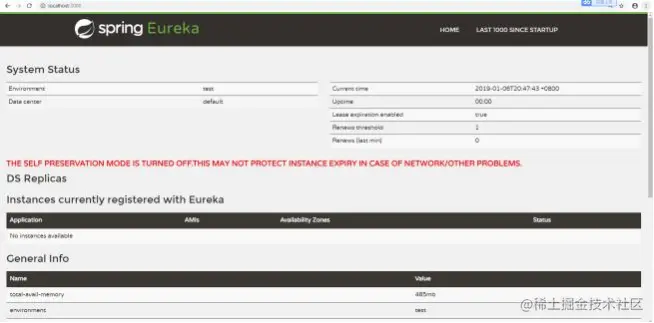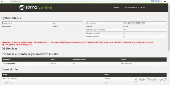 这里我们能看见 名字叫server-power的(图中将其大写了) id为 power-1的服务 注册到我们的Eureka上面来了 至此,一个简单的eureka已经搭建好了。
