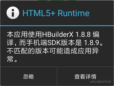 "ignoreVersion": true //true表示忽略版本检查提示框,HBuilderX1.9.0及以上版本支持