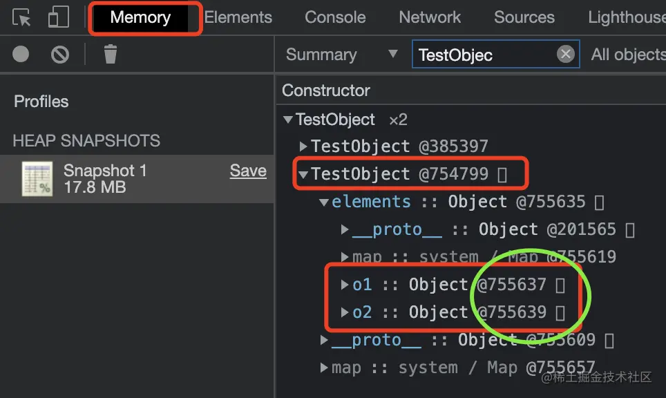 我们利用Memory获取了,此时内存信息。我们特意查看了TestObject中elements发现,针对他两个属性o1/o2所存的数据都放在不同的内存地址上。