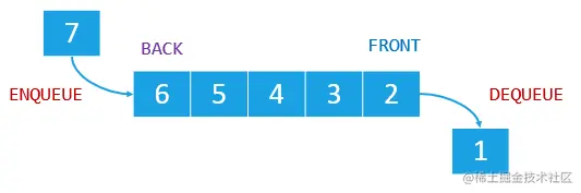 队列是一种遵从先进先出(FIFO)原则的有序集合。队列在尾部添加新元素,并从顶部移除元素。最新添加的元素必须排在队列的末尾。