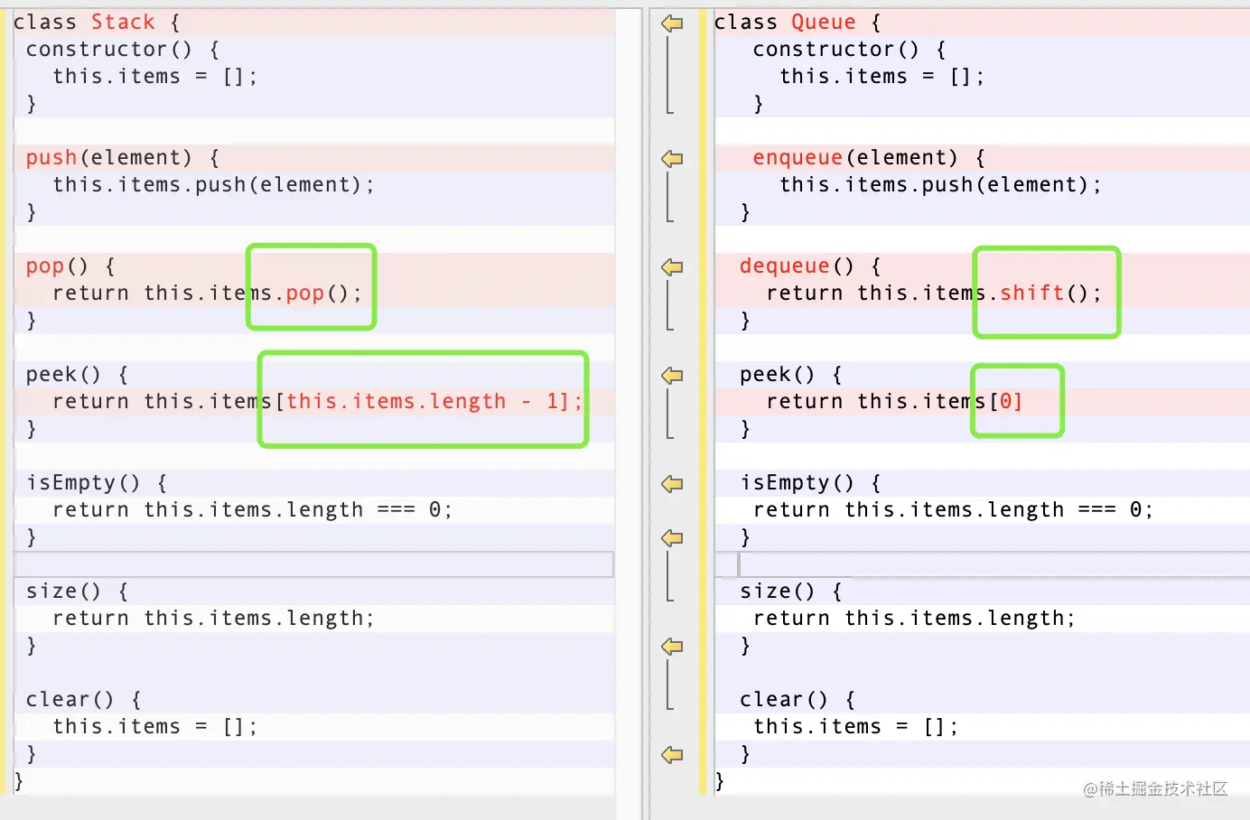 下面是用数组实现stack和queue的具体代码。可以发现,在利用数组实现这两个数据结构时候,除了针对剔除/查看数据有点不同,其他方法都一模一样。(除去方法名的差异)