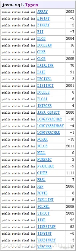 publicclass Typesextends Object:定义用于标识一般 SQL 类型(称为 JDBC 类型)的常量的类。