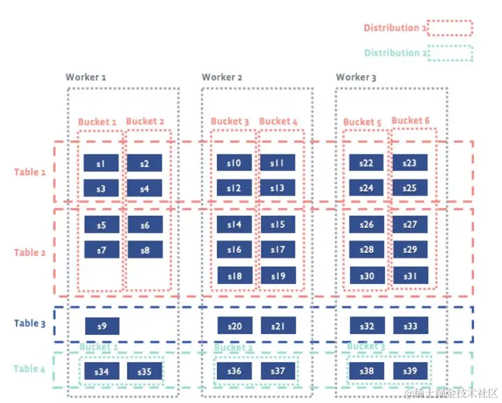 ● 本地关联:当在桶列上关联同一distribution的表时,Raptor将进行本地关联(Collocated Join),因为具有相同连接键的数据在同一个worker上,避免了重新分配。