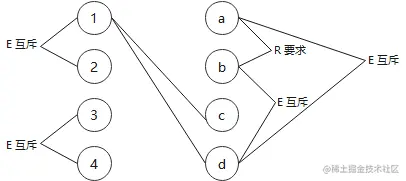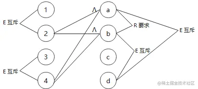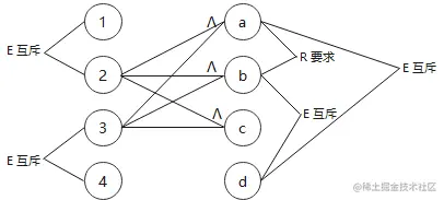 - 互斥 E:a、b、c 只能有一个成立,但是可以都不成立。