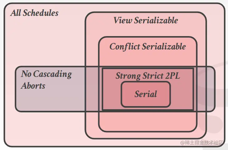 如果用韦恩图来描述事务之间执行顺序的可能情况的话,我们可以发现强两阶段锁机制正好将解覆盖到了合理的范围。