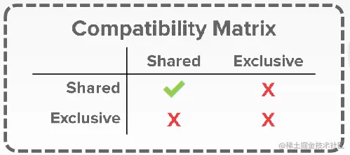 我们描述一般意义上的锁是针对事务的概念,而不是指在操作系统中会讲到的读写锁。基本的,我们能够将针对事务的最基本的锁分为两种,共享锁和排他锁,它们的兼容性如下图所示