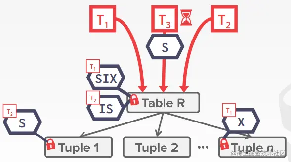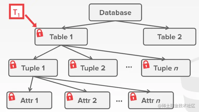 当一个事务想要更新一个表中的十亿个元组,如果它遵循行锁作为锁的粒度的话,它必须向DBMS的锁管理器请求十亿个锁。这很慢,为了避免这种开销,DBMS 可以使用锁层次结构,该层次结构允许事务在系统中采用更粗粒度的锁。例如,它可以在表上获取具有 10 亿个元组的单个锁,而不是 10 亿个单独的锁。当事务获取此层次结构中对象的锁时,它将隐式获取其所有子对象的锁。如下图所示,T1事务能够对表1上一个大锁。